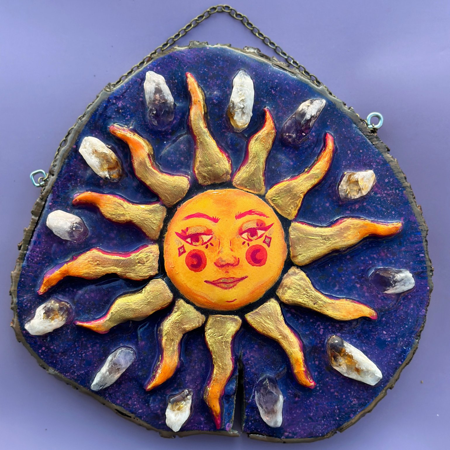 Clay sculpture on top of self cut stump. Hand painted with added crystals sealed with resin.